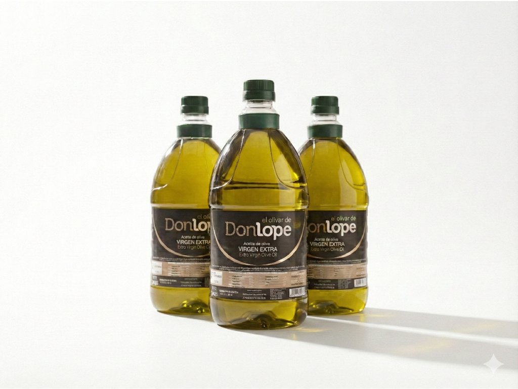 Olivový džús (100% extra panenský olivový olej), z odrôd picuda, picual a hojiblanca. 100 % extra panenský olivový olej Donlope.